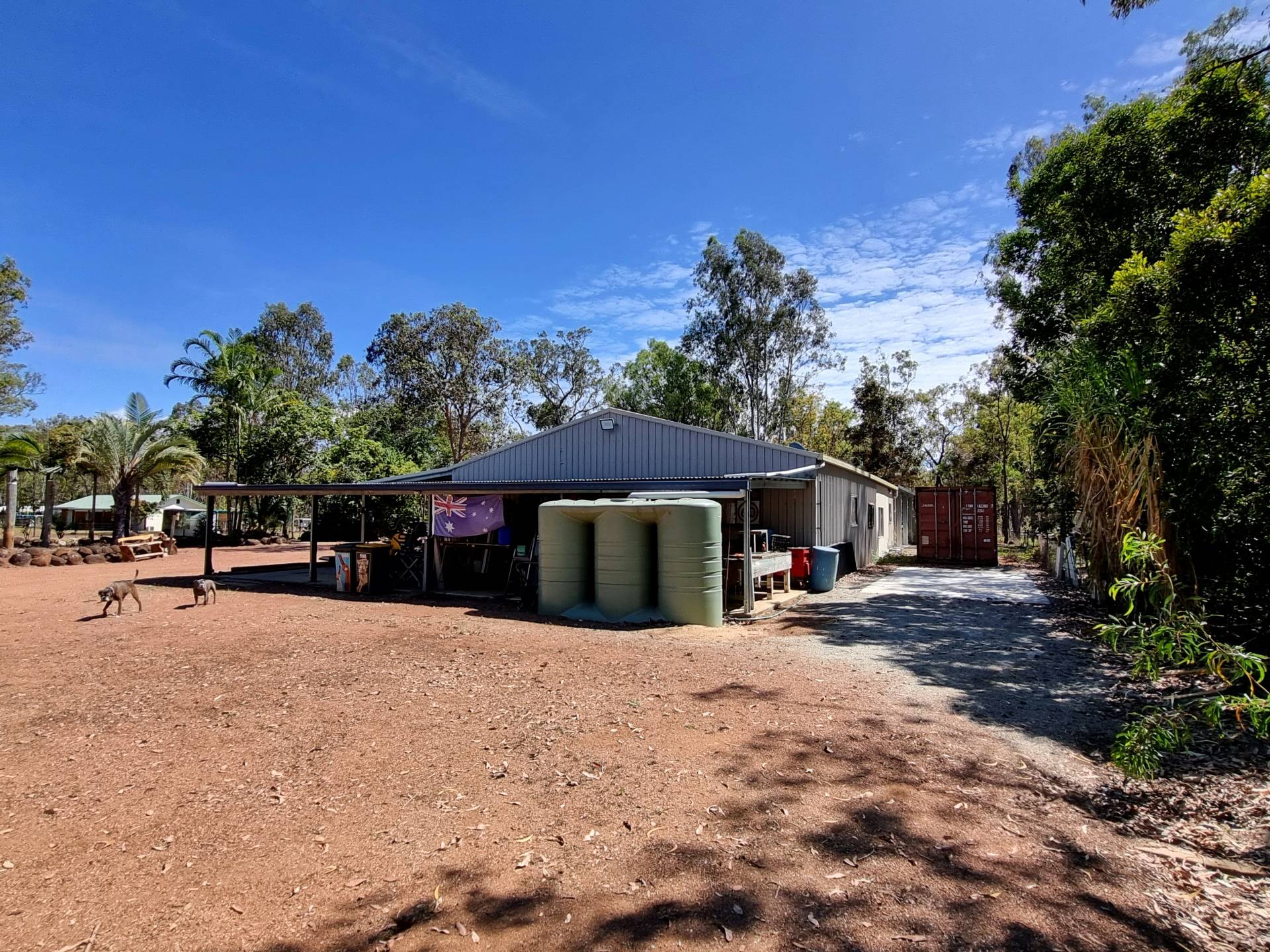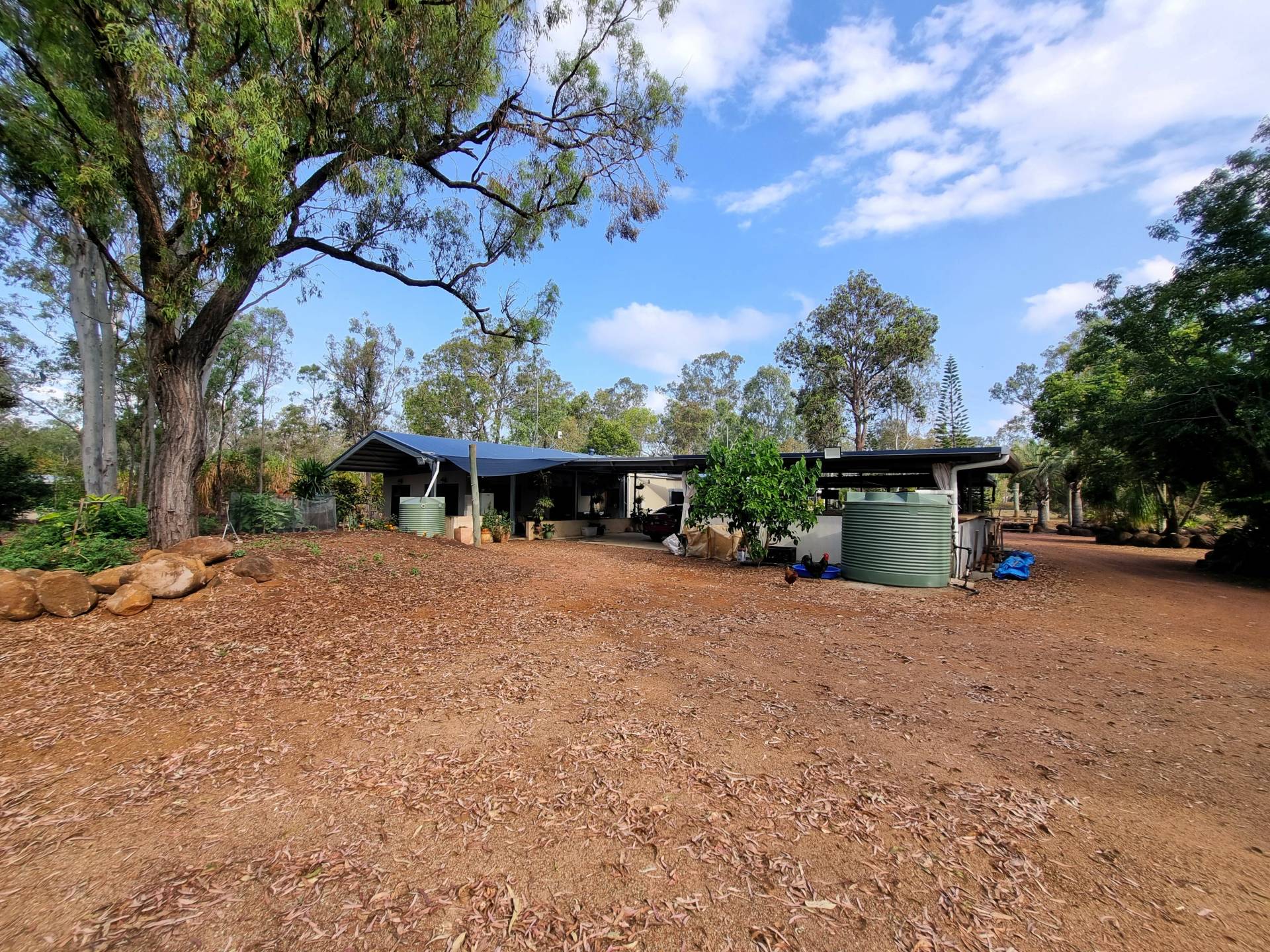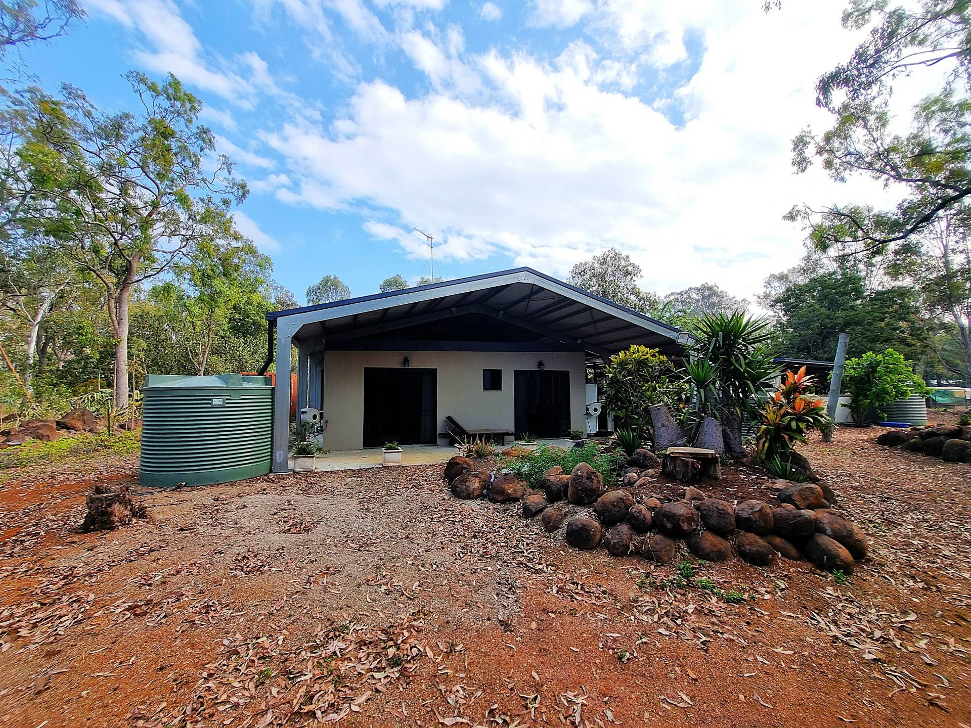 The beautifully landscaped front yard features a solar powered bore feeding irrigation pipes and water tanks. Water security is assured with town water, a 17500l, three 5000l, and one 2500l tank adding up to 35000 litres.