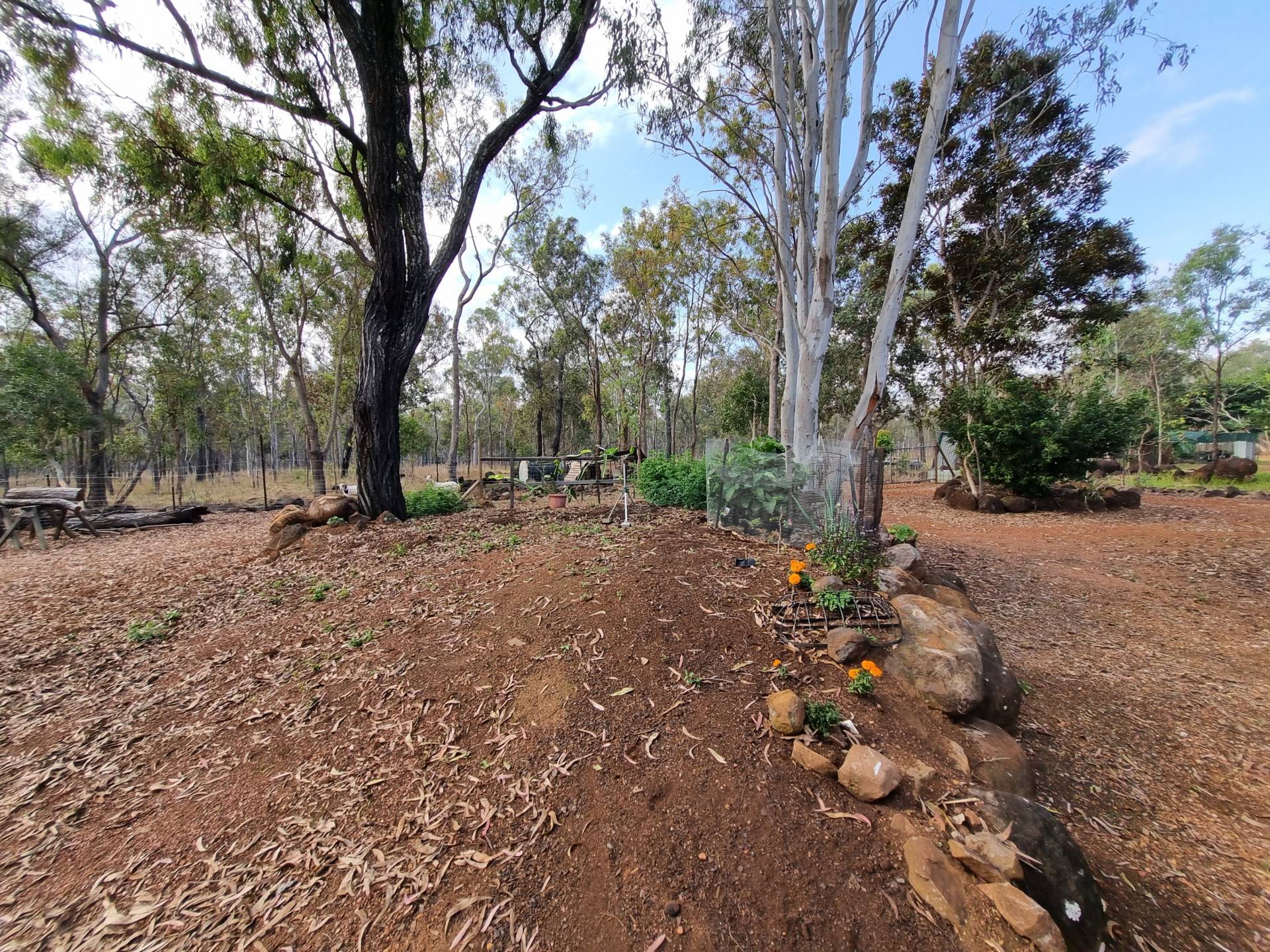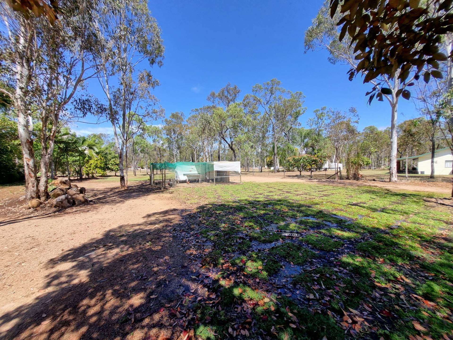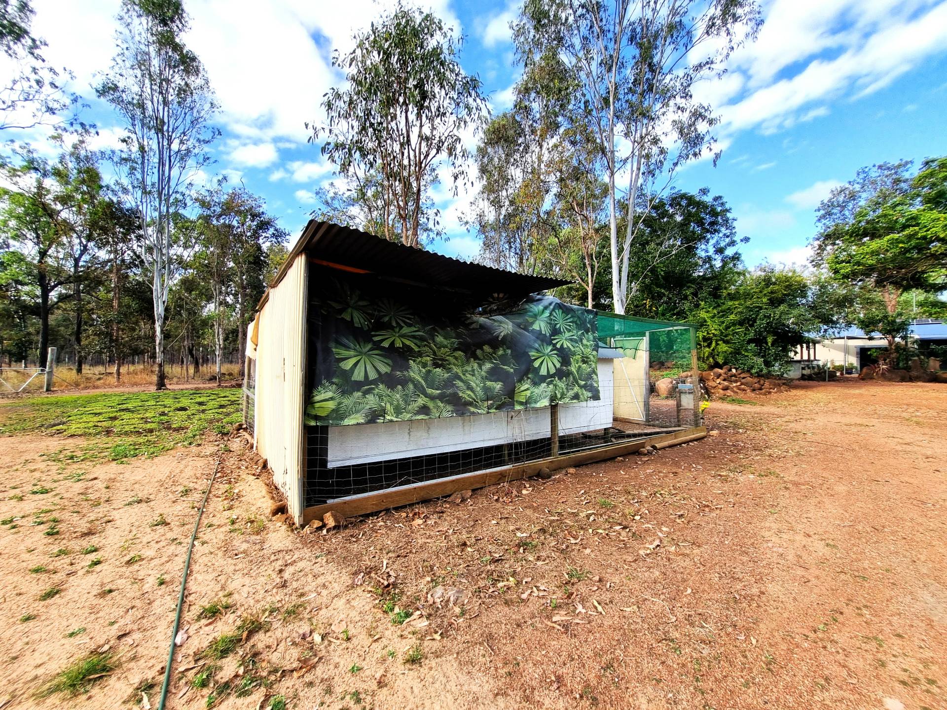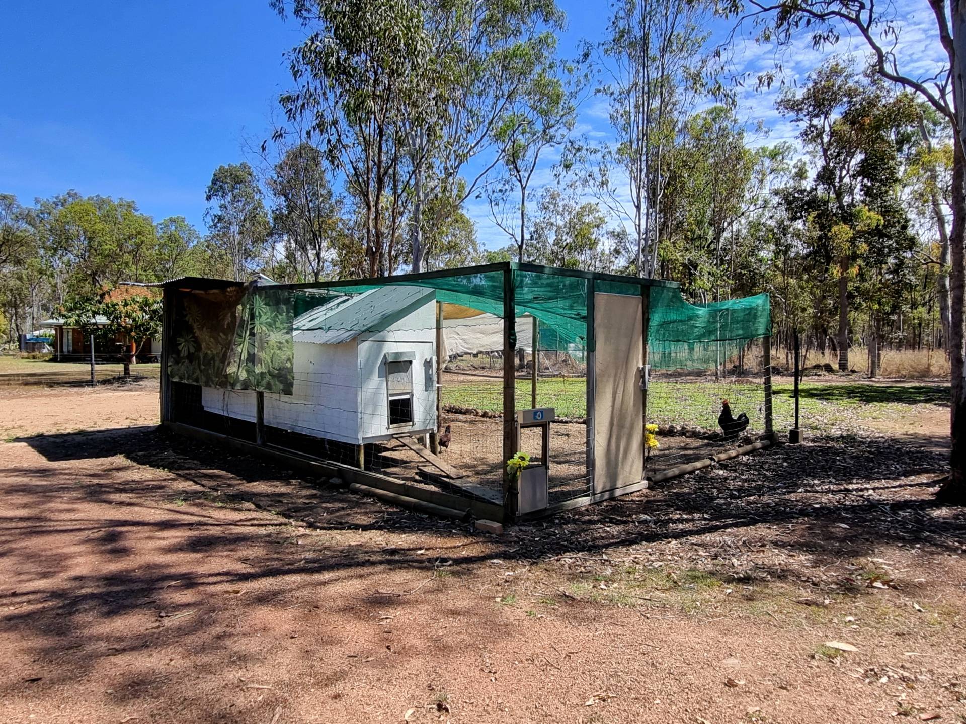 Further on there is the Taj Mahal of chook houses with a fenced run and printed shade cloth.