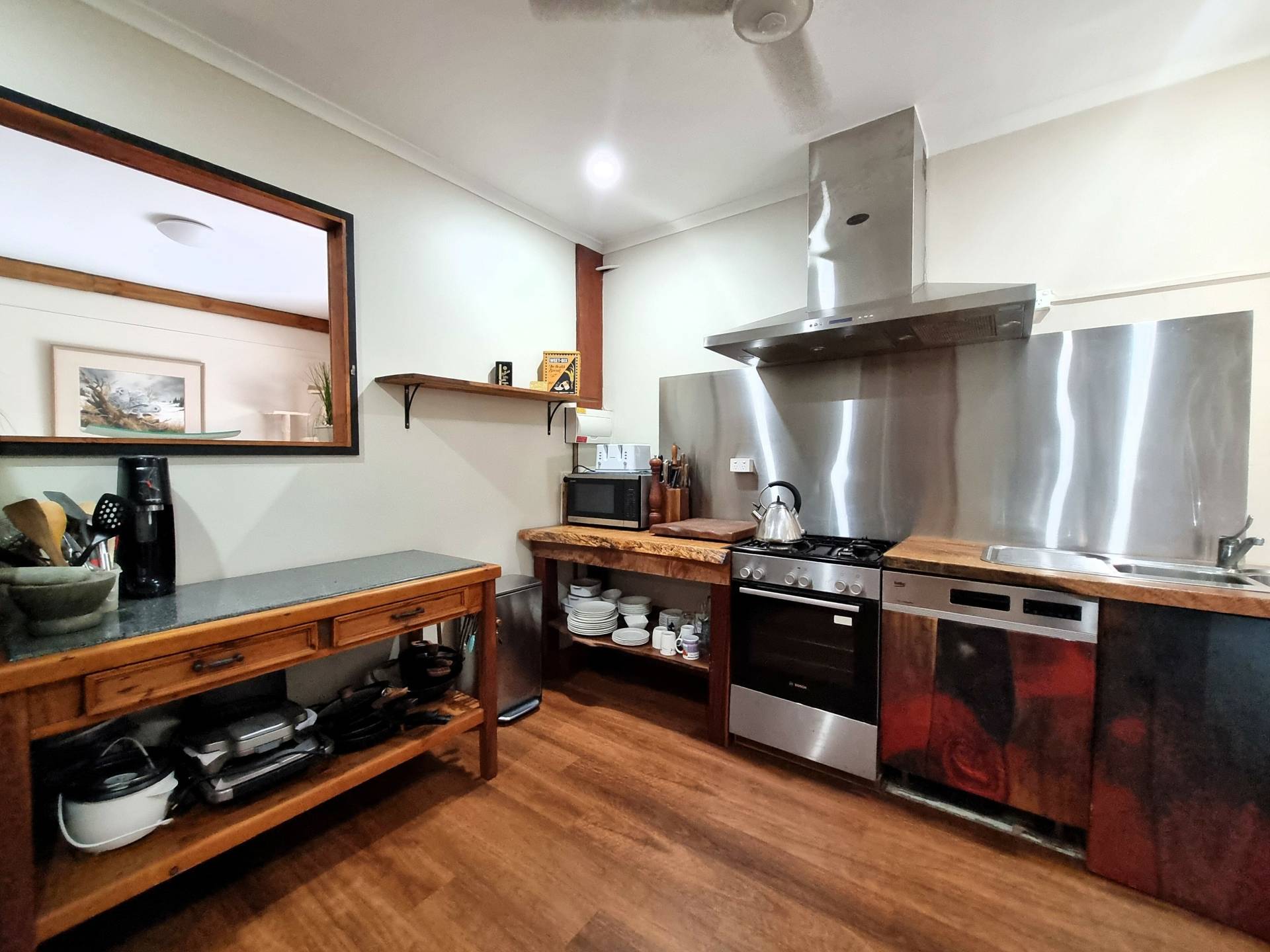 Drive through the electronic front gates and park in the four bay garage to find a stunning home featuring a modern kitchen with a four-burner gas stove, custom built timber bench tops, stainless steel rangehood, and a handy server window servicing the dining room.