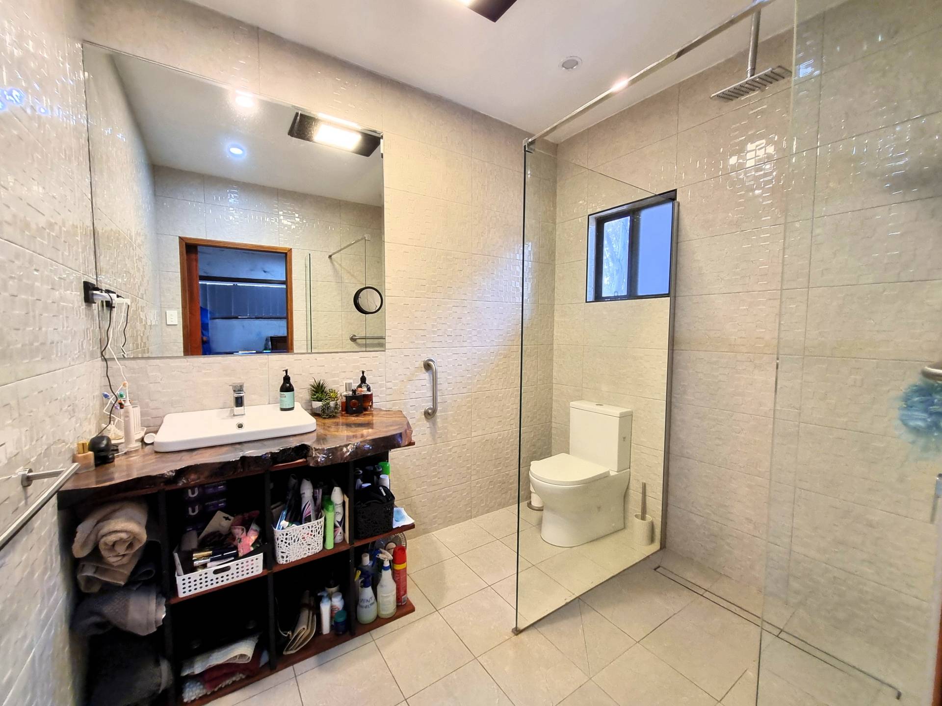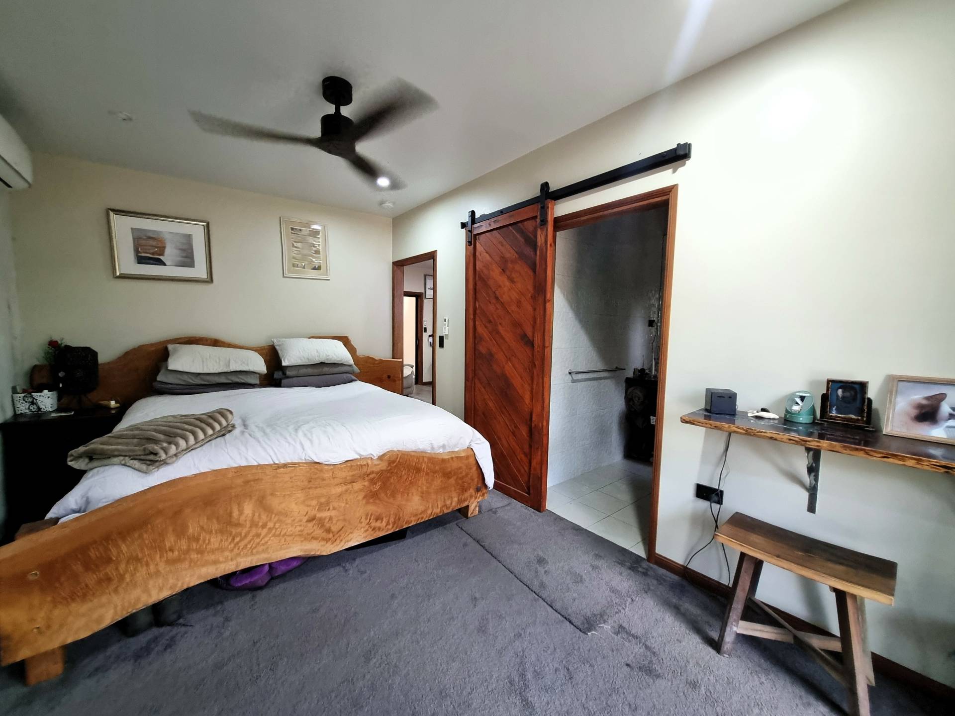 The 14m master bedroom with split system aircon and quality timber fan is serviced by an ensuite bathroom with a custom-built timber top vanity, a toilet, shower, and floor to ceiling tiles.